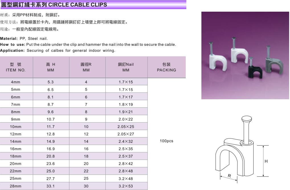 circle cable clips Model: round type, Specifications: Diameter 3.5mm ---- 25MM. Material : PP; PE,Flexibility, impact resistance, not broken,with nail.